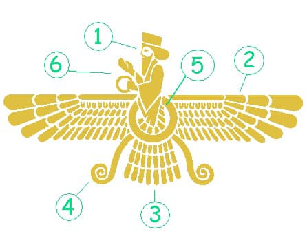 Faravahar mamoolan be shekle yek ensan-e baldar neshan dade mishavad va har bakhsh az an mani-ye khasi darad: